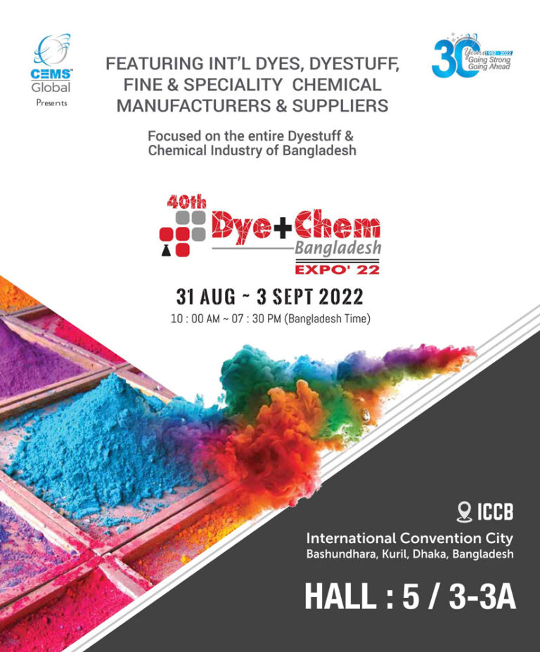 40.th DYE+CHEM – 31 Ağustos – 3 Eylül 2022 Bangladeş Tekstil Kimyasalları ve Boya Fuarına katılım gerçekleştireceğiz.